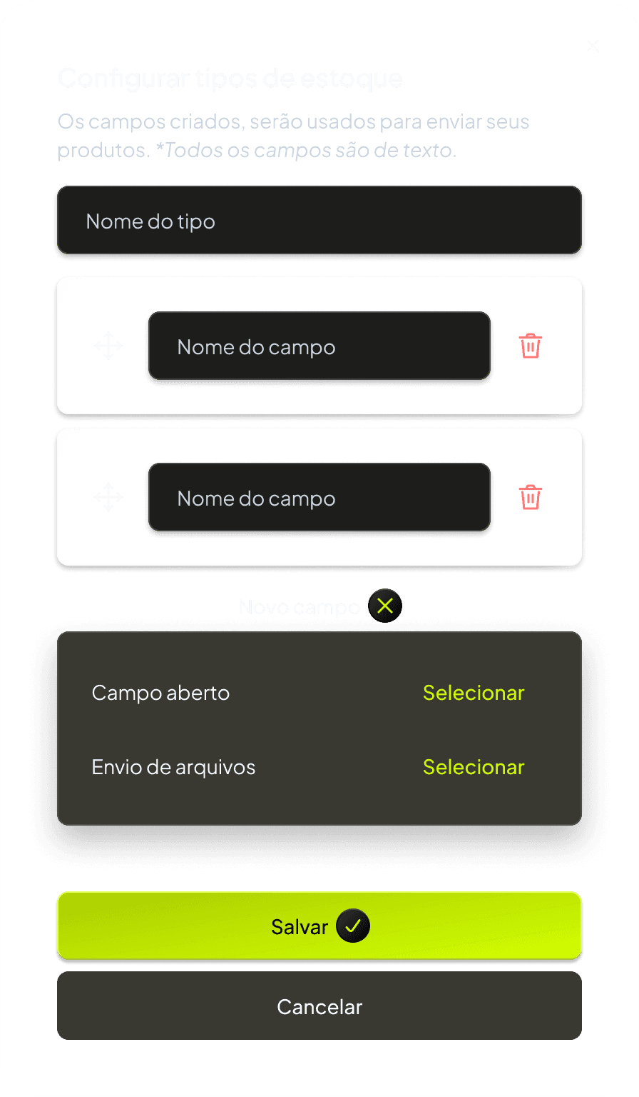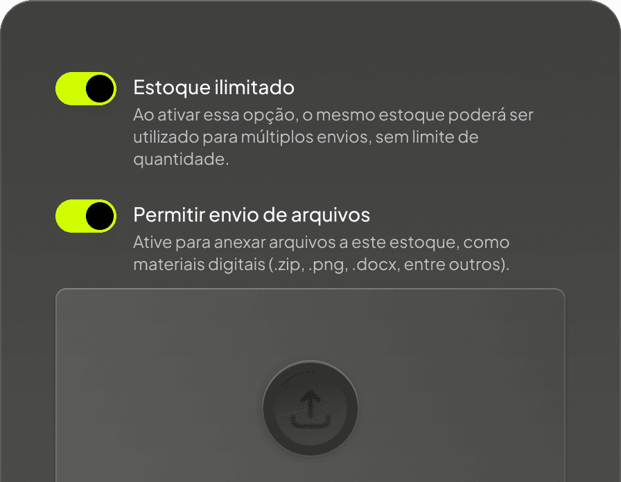 Defina se o estoque é ilimitado, se vai enviar anexos e quais campos deseja para o estoque.