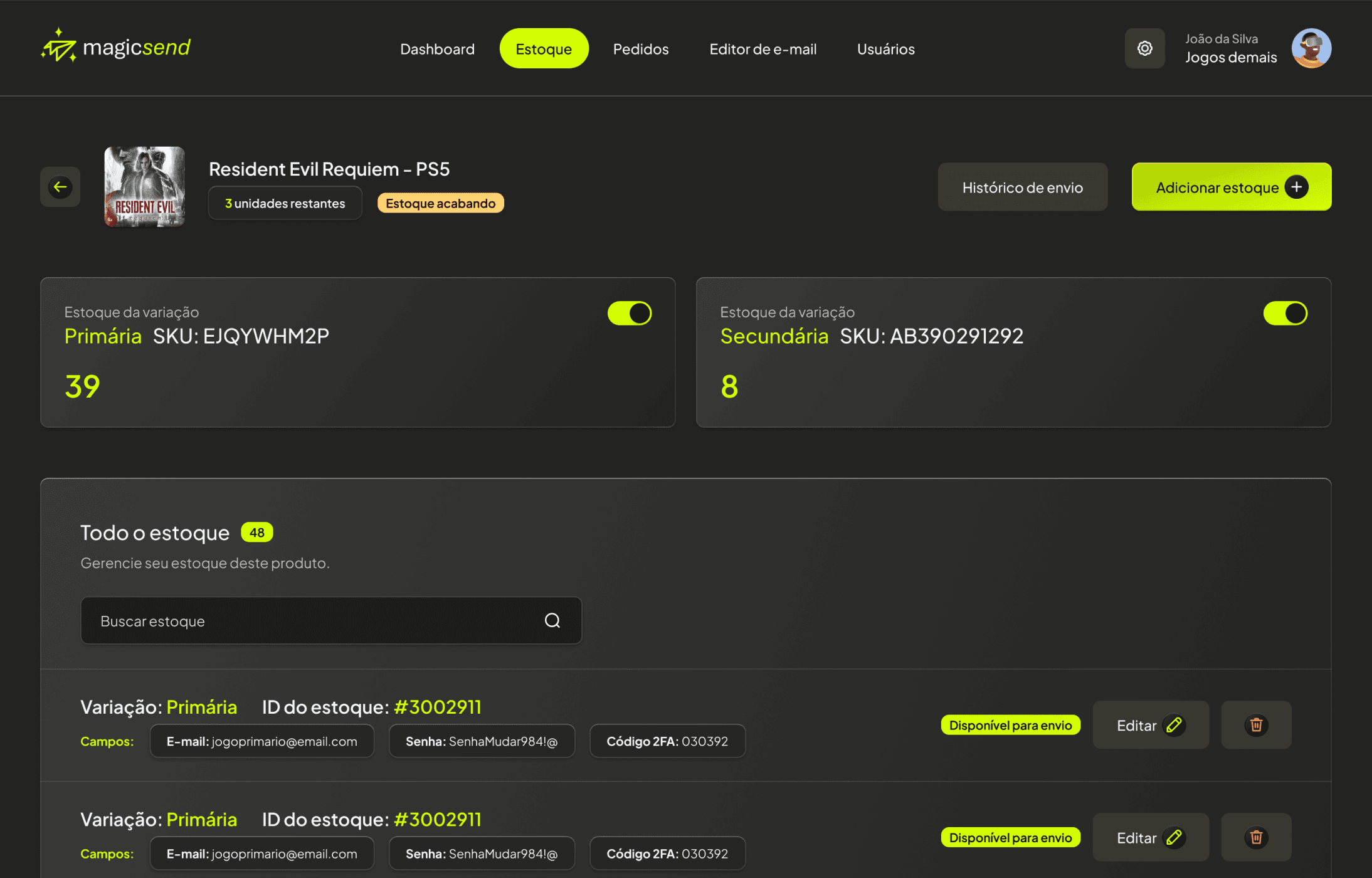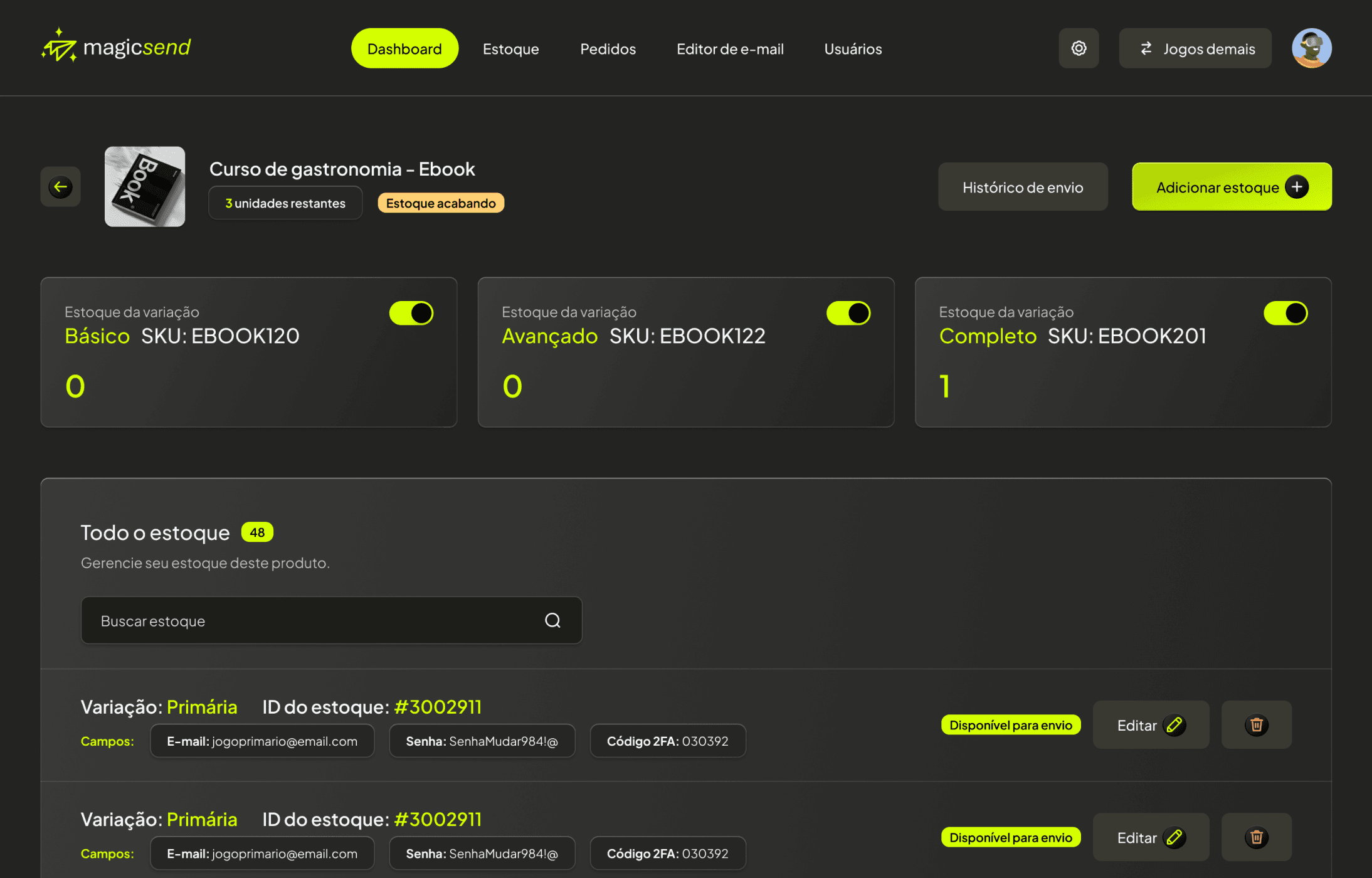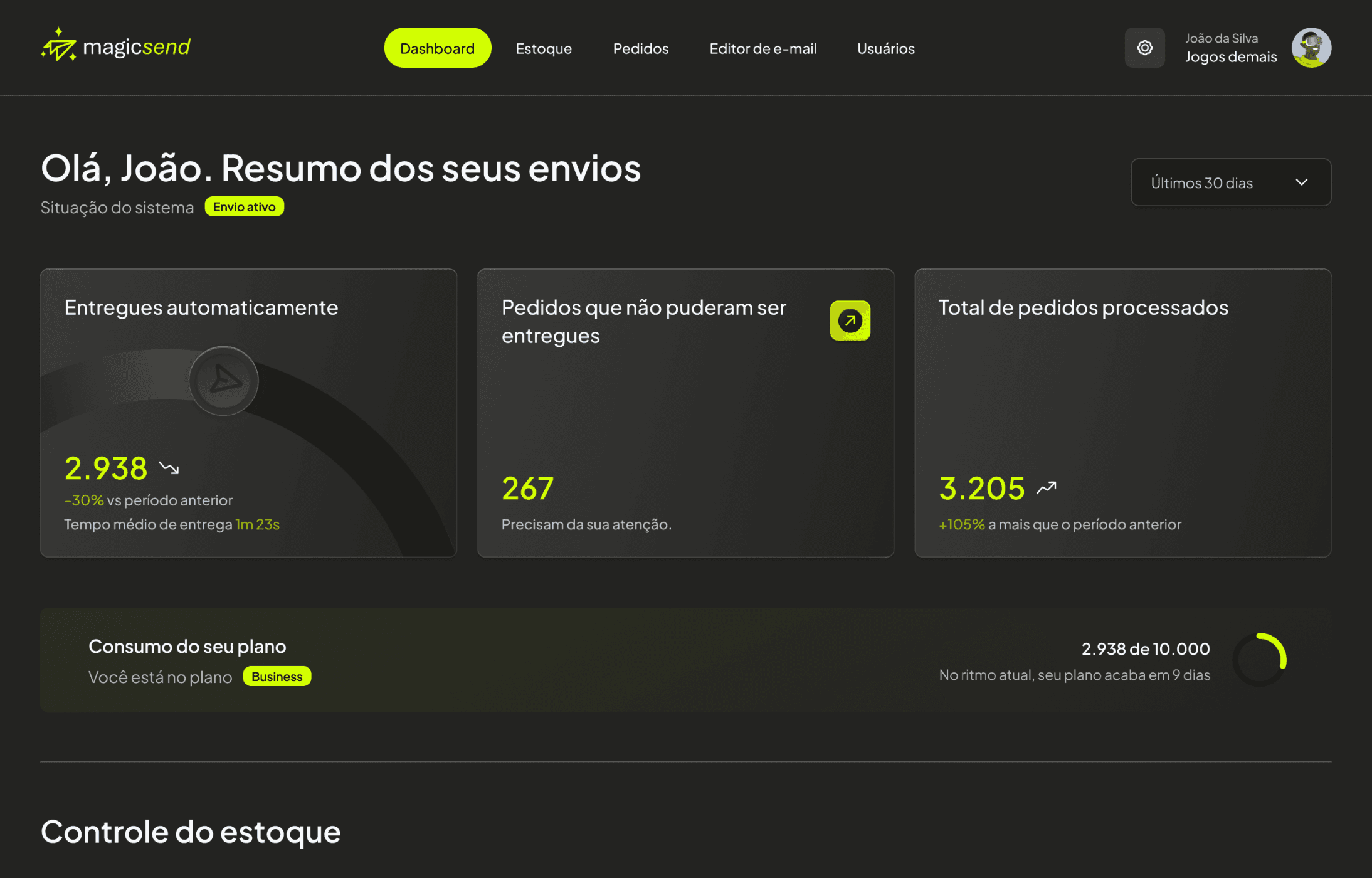 Se um envio não acontecer por falta de estoque, mostramos exatamente onde está o problema e o que precisa ser ajustado.