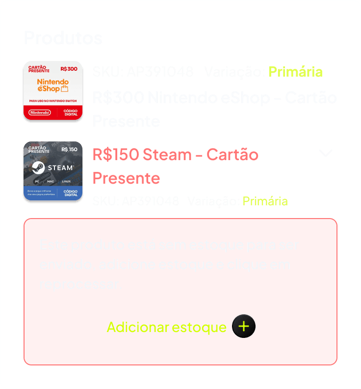 Faltou estoque no momento da venda? Assim que regularizar, reprocesse o pedido de forma rápida e simples. Sem perder vendas. Sem complicação.